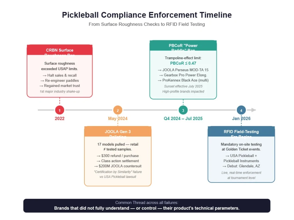 Understanding today’s compliance landscape starts with its history. Enforcement mechanisms have evolved rapidly — from basic surface roughness checks to complex energy-return metrics and live, on-site tournament testing. Each enforcement action has raised the stakes for every brand in the market.