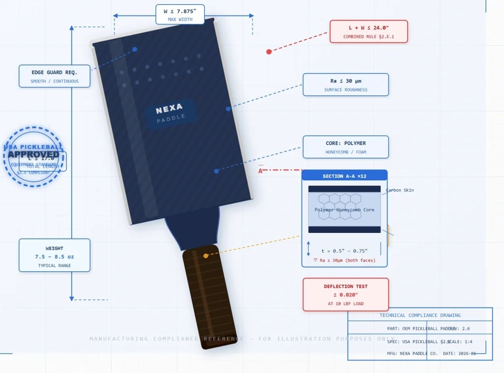 Before authorizing production, demand documented evidence of the following: batch-level surface roughness measurements (Rt and Rz) showing results below — not merely at — the official USAPA limits; internal PBCoR targets with a compliance buffer below ≤0.47; and, for thermoformed models, accelerated aging simulation data projecting 6-month PBCoR performance. You should also clarify the contractual liability if a finished batch fails USAPA certification or RFID field testing — specifically who absorbs the cost of the $4,500 resubmission fee, retooling, and any launch delay. NexaPaddle’s custom paddle program provides all of these documentation elements as standard practice.