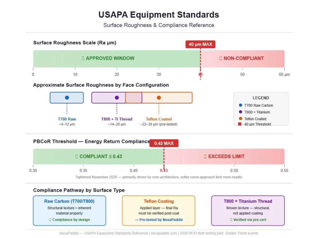 USA Pickleball’s Equipment Standards specify a maximum surface roughness of 40 micrometers Ra for approved paddles. Paddles exceeding this threshold are not approved regardless of other specifications.