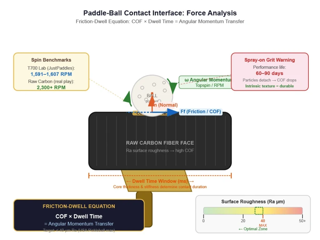 Spin performance originates at the friction interface between paddle face and ball. The key variables are: surface coefficient of friction (higher = more spin), surface micro-texture (intrinsic texture engages the ball’s polymer surface during dwell time), and dwell time (core thickness and stiffness influence how long the ball stays in contact with the face). The best spin-optimized paddles combine a high-COF face material — raw carbon fiber or Teflon-coated carbon — with an appropriate core architecture that allows sufficient dwell time for maximum angular momentum transfer.