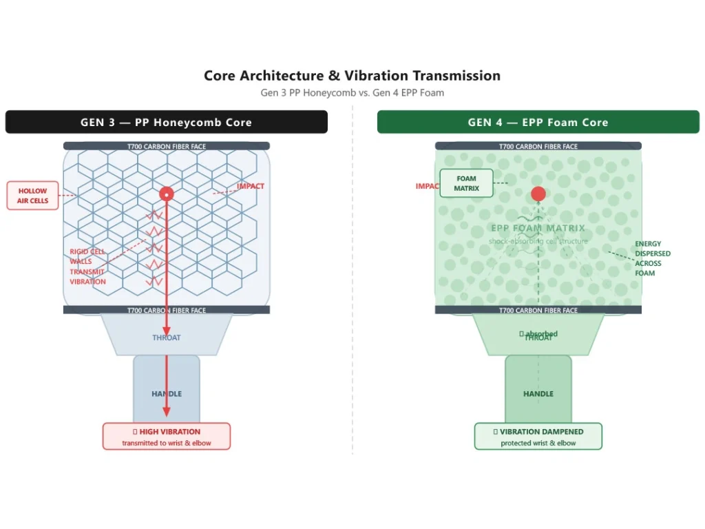 Gen 3 paddles use an engineered PP honeycomb core, thermoformed into a unibody carbon fiber structure. They deliver crisp, high-power ball feel with excellent energy return — ideal for offensive and power players. Gen 4 replaces the honeycomb with an EPP foam core, which converts vibration energy into heat through micro-compression rather than transmitting it to the player’s hand. The result is a paddle with meaningfully reduced vibration transmission, a softer dwell feel, and significantly better arm-fatigue performance over extended play sessions. Gen 3 = crisp power. Gen 4 = comfort-first with controlled power.