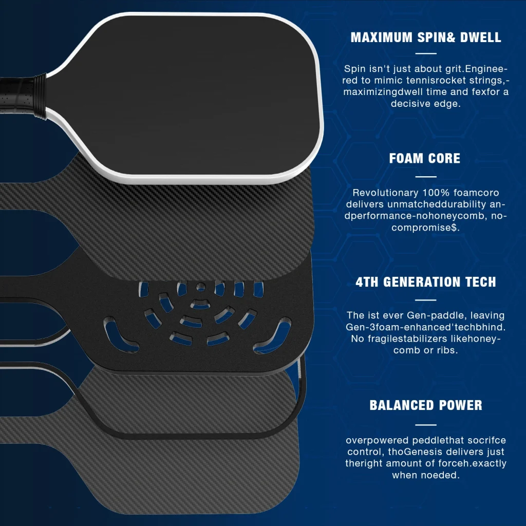 Pioneered by JOOLA (Perseus Pro IV and related models), the 4S construction inserts dual EVA foam layers into the throat area of the paddle — rather than replacing the entire core. The honeycomb core remains intact; the foam is engineered into specific high-vibration transmission zones. The result is a hybrid feel: Gen 3’s crisp power profile in the body of the paddle, with targeted dampening at the throat where vibration most commonly enters the handle.
