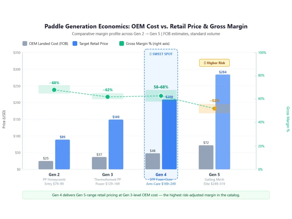 At 15–20% Amazon return rates for high-vibration paddles vs. estimated 8–12% for well-reviewed foam-core paddles, the effective margin improvement on Gen 4 is meaningful beyond the OEM cost differential.