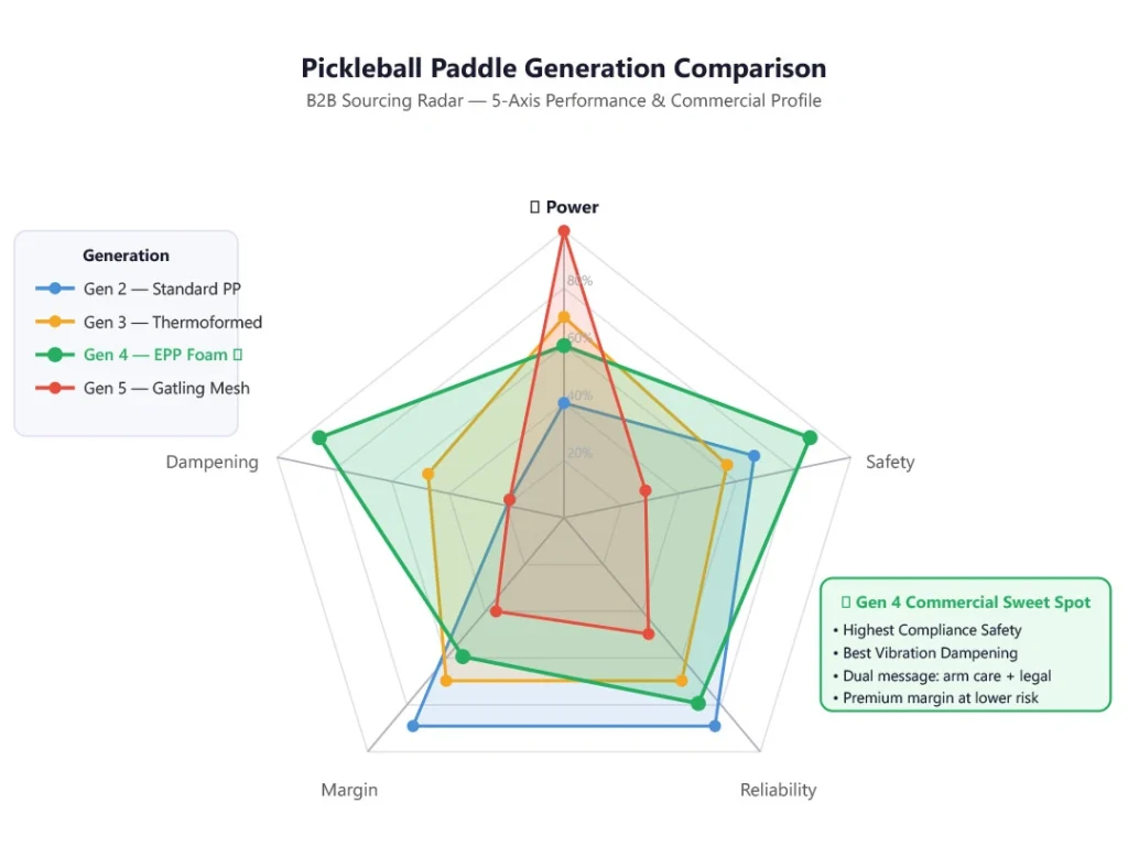 Gen 4 EPP foam cores sit comfortably within the USAPA PBCoR ≤0.43 envelope — a critical commercial advantage over Gen 5 Gatling mesh designs that push right against the compliance ceiling. The foam core’s energy absorption mechanism naturally reduces the paddle’s coefficient of restitution, which means Gen 4 paddles have significant headroom below the limit. For brand owners, this translates to a lower risk of compliance failure — and none of the JOOLA-style decertification scenario risk that has made some buyers cautious about Gen 5.