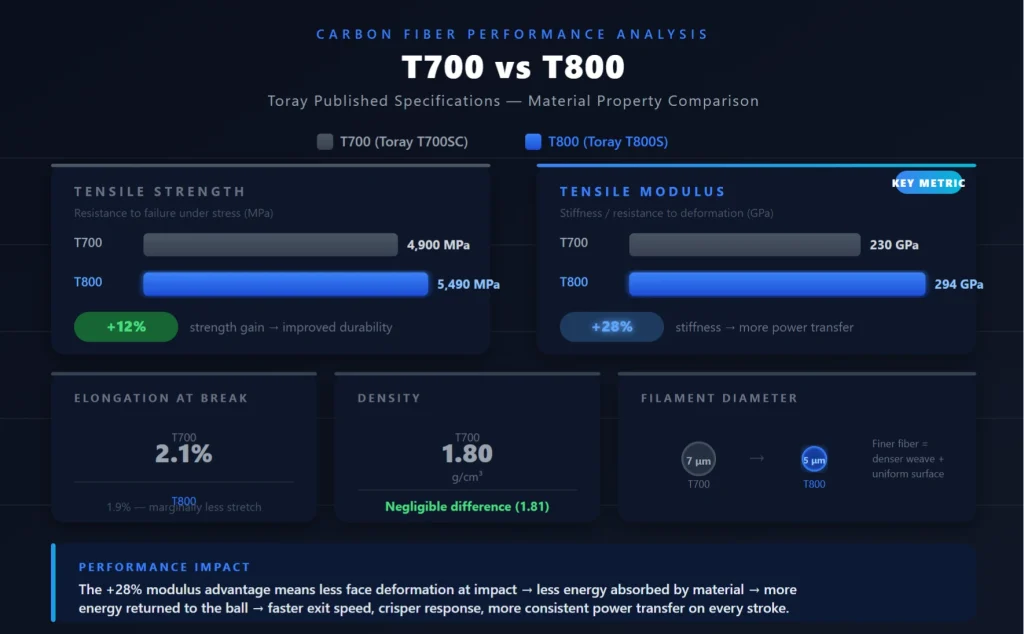 The 28% higher tensile modulus of T800 (294 GPa vs 230 GPa) has a direct mechanical consequence: the face deforms less at ball contact, which means less kinetic energy is absorbed into face deflection and more is transferred back into the ball as exit velocity. For drives and serves — the shots where raw exit speed matters most — a T800 face is measurably faster than a T700 face under equivalent swing mechanics.