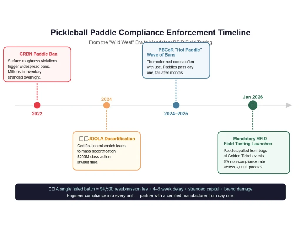 The era of the “wild west” in pickleball manufacturing is over. Starting in January 2026, USA Pickleball, in conjunction with Pickleball Instruments, launched mandatory RFID field testing at all Golden Ticket events. This fundamentally changed the risk profile for brand owners. It is no longer enough to pass a one-time laboratory certification. Paddles are now pulled directly from players’ bags and subjected to on-site compliance checks. The initial data was sobering: a 6% non-compliance rate across more than 2,000 paddles tested during the program’s rollout.