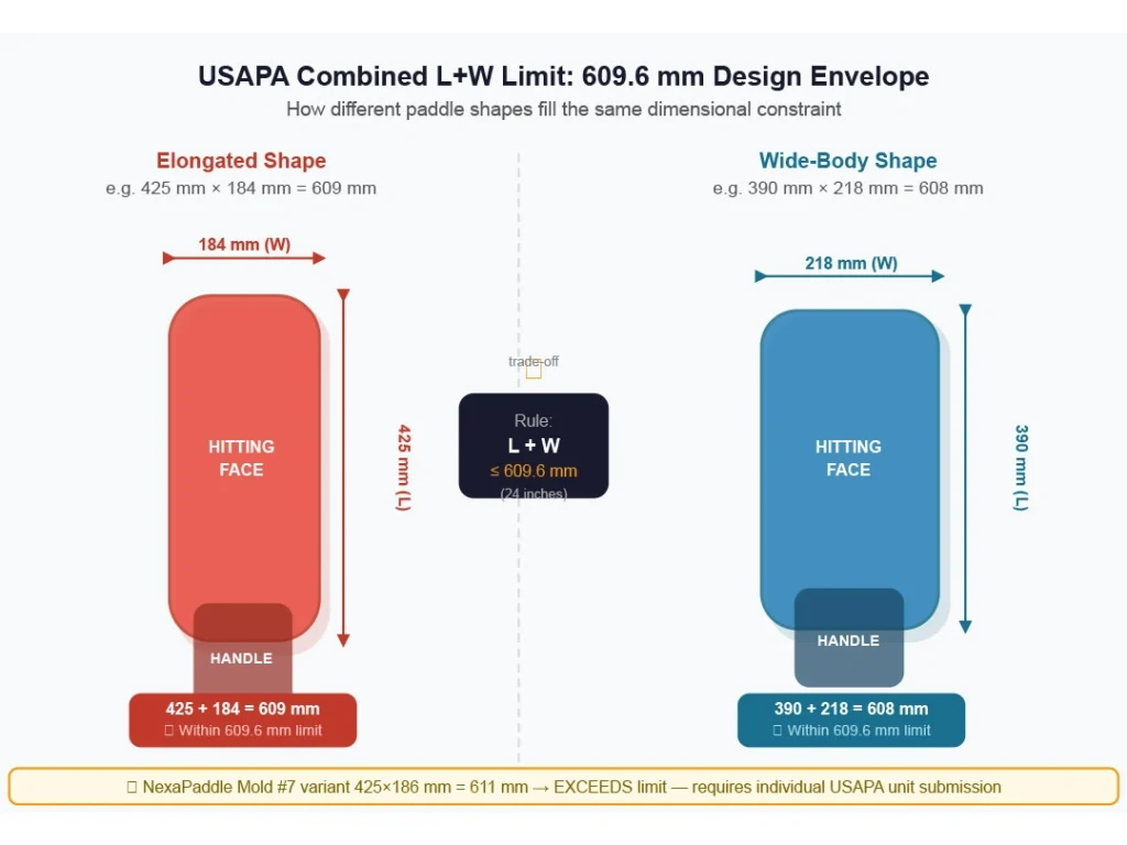 One compliance note for B2B buyers: Some NexaPaddle molds intentionally leave margin below the 609.6 mm ceiling. Mold #7 at its 425×186 mm variant sums to 611 mm and therefore operates at or slightly beyond the standard limit — this configuration requires individual unit submission for USAPA approval before use in sanctioned play. The 420×185 mm variant of the same mold (605 mm total) is comfortably within limits. Always confirm the specific dimensional variant with your sourcing contact before adding “USAPA Approved” claims to marketing materials.