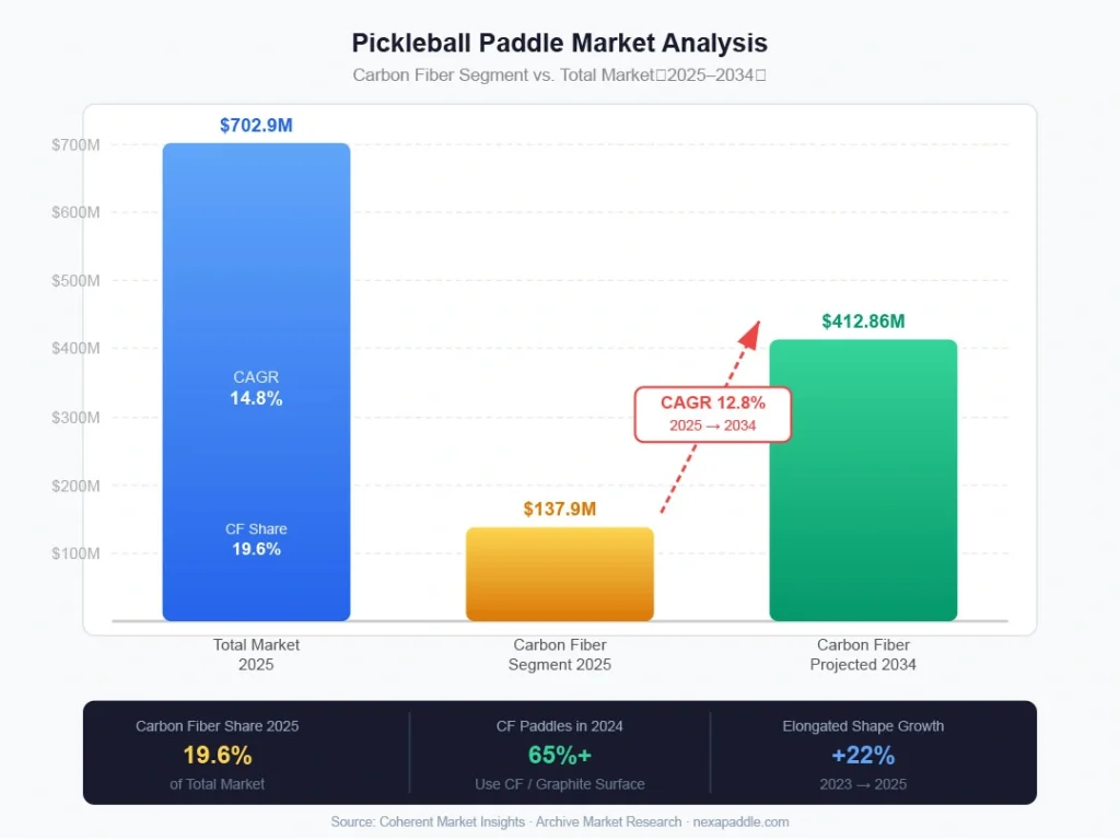 Grand View Research / Coherent Market Insights. US Pickleball Equipment Market Report, 2025. Carbon fiber segment CAGR and market size projections cited from industry research. US total market estimate: $702.9M (2025).