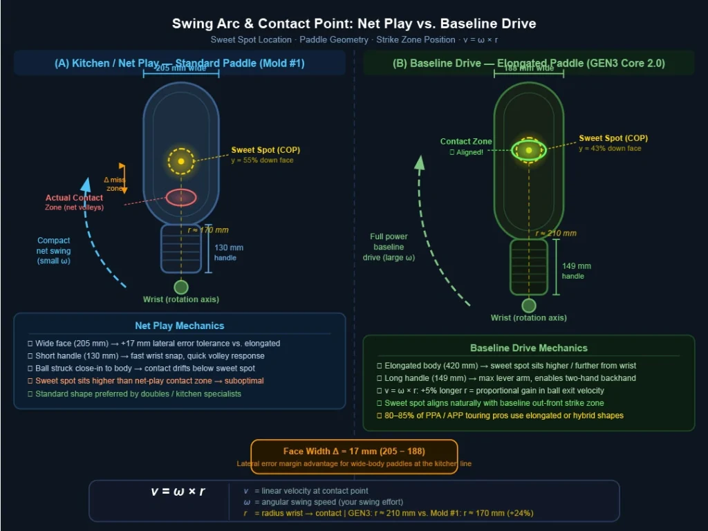 The 17mm width difference translates primarily to lateral sweet spot margin — the horizontal distance between the center of percussion and the paddle edge. On the wider 205mm paddle (Mold #1), off-center hits toward the lateral edge travel further before leaving the effective strike zone. On the narrower 188mm elongated shape, that margin is reduced, requiring more precise horizontal contact. However, the elongated paddle gains vertical sweet spot margin: more face length above and below the geometric center. Neither is objectively “better” — each suits a different player context and skill level.