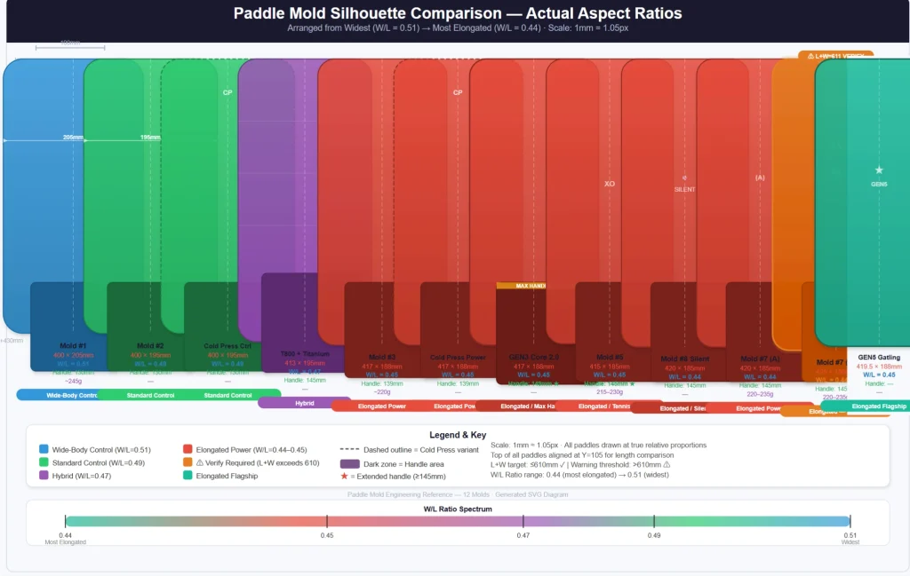 This guide corrects that. It covers the USAPA regulatory envelope, the mechanics of aspect ratio, how each of the three primary shape categories (standard, wide-body, and elongated) performs differently at ball-strike, and how to match NexaPaddle mold specifications to your specific product line strategy.