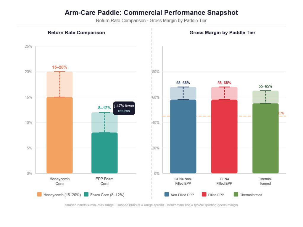 Commercial Implication: EPP foam core paddles currently occupy the premium segment ($169–$249 retail), yet the arm-care pain point creates genuine willingness-to-pay in the 40+ demographic. A brand positioning around recovery and comfort can command these price points without competing directly against power-focused brands on performance metrics.