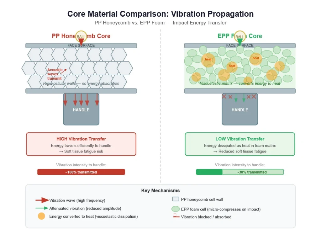 PP honeycomb is a rigid cellular structure that transmits impact energy efficiently — which is good for ball speed but bad for arm protection, because the same efficiency applies to vibration transfer into the handle. EPP foam uses a viscoelastic mechanism: the foam micro-compresses on impact and converts a portion of the high-frequency vibration energy to heat through internal molecular friction. The result is a dampened, softer impact character that reduces the cumulative vibration load on the wrist and forearm during extended play.