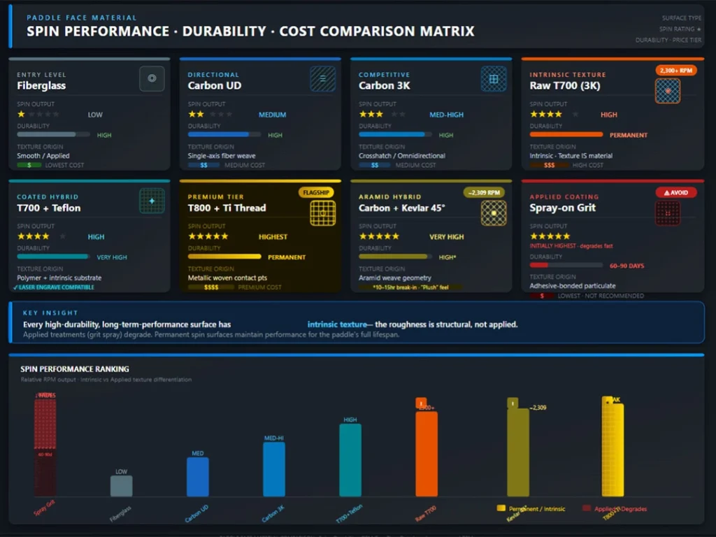 Based on production data and independent testing: Raw T700 carbon: 2,300+ RPM in real-play conditions. Kevlar/Aramid 45° weave: ~2,309 RPM (Six Zero Ruby Pro independent measurement reference). T800+Titanium Thread: highest ceiling in NexaPaddle’s catalog — specific RPM varies by paddle configuration and measurement conditions. Carbon 3K (cold press): lower than thermoformed T700 but still competitive for mid-tier spin positioning. Spray-on grit: can initially exceed all of these figures out of the box, but declines significantly within 60–90 days. For sourcing purposes, the directional hierarchy is: T800+Ti Thread > Kevlar hybrid ≈ Raw T700 > Carbon 3K > Fiberglass > (grit spray at 6+ months).