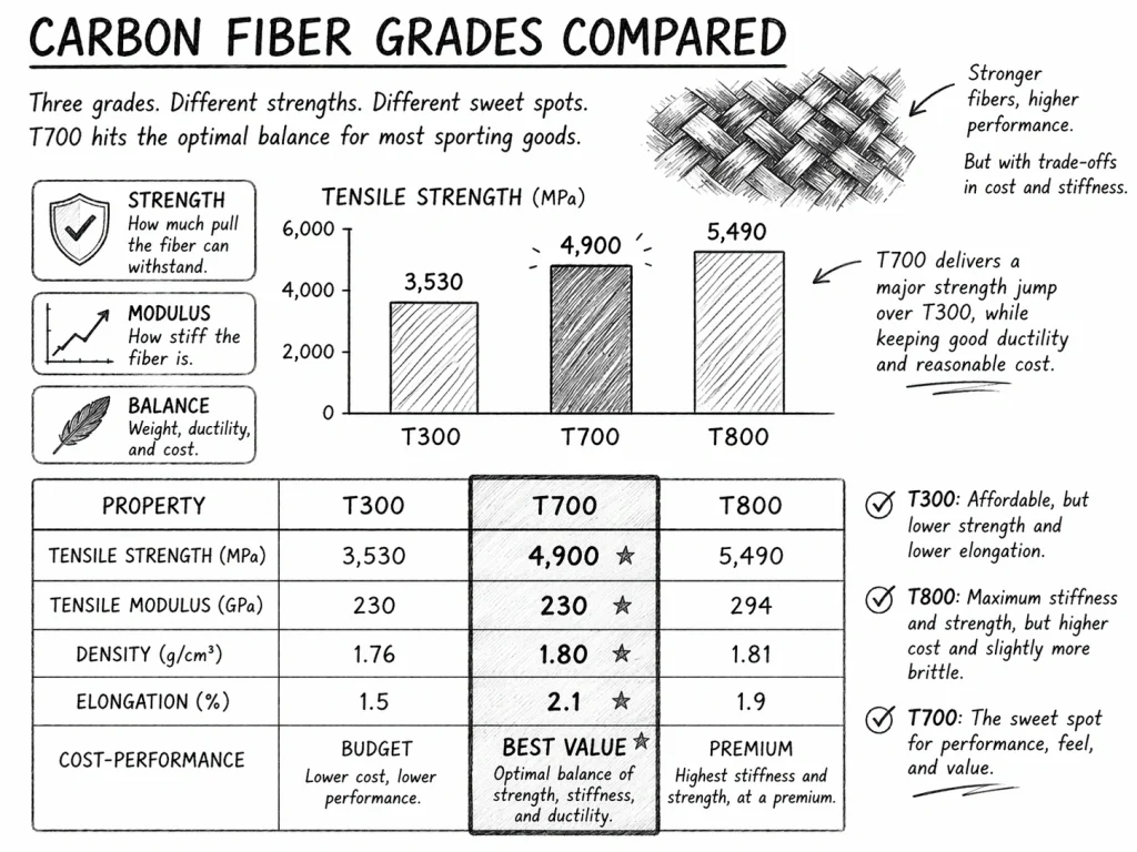 There are three carbon fiber grades commonly discussed in sporting goods: T300, T700, and T800. Understanding where T700 sits — and why it’s not T300 or T800 — requires looking at all three simultaneously.