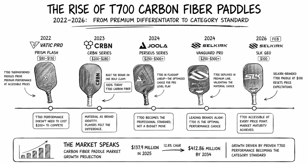 Selkirk’s SLK Geo, launched in February 2026 at $100 retail with T700 construction, effectively reset consumer price expectations. When a Selkirk-branded T700 thermoformed paddle hits $100, it signals that the manufacturing economics are mature enough to make T700 accessible at all market levels.