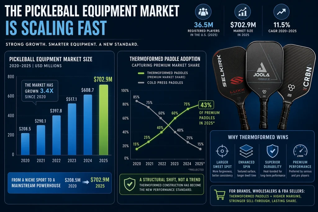The QY Research Pickleball Market Report (February 2026) projects continued acceleration in the premium paddle segment through 2028. The brands that establish themselves in thermoformed construction now — before the category reaches full saturation — will have the catalog depth, the review volume, and the distribution relationships that compound into durable competitive advantage.