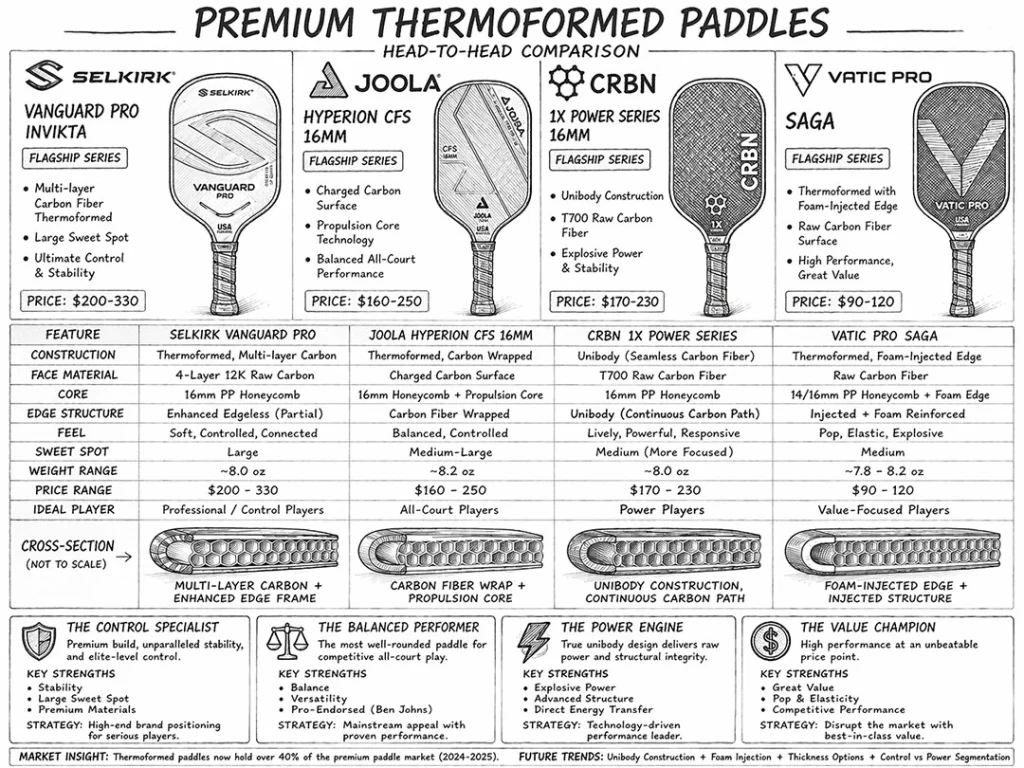 The technology gap between legacy premium brands and challenger brands in pickleball has effectively collapsed. Thermoforming is no longer a differentiator exclusive to $250 flagship models — it is the new baseline for any paddle positioned above the $130 retail tier. The brands that grasped this early have used it to build market share. The brands that haven’t are losing it.