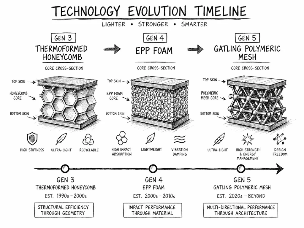 - Gen 3 Thermoformed Honeycomb: Still highly viable and widely used in the premium segment. Engineered PP honeycomb with tighter cell geometry than standard cold press cores, optimized for the thermal bonding process.