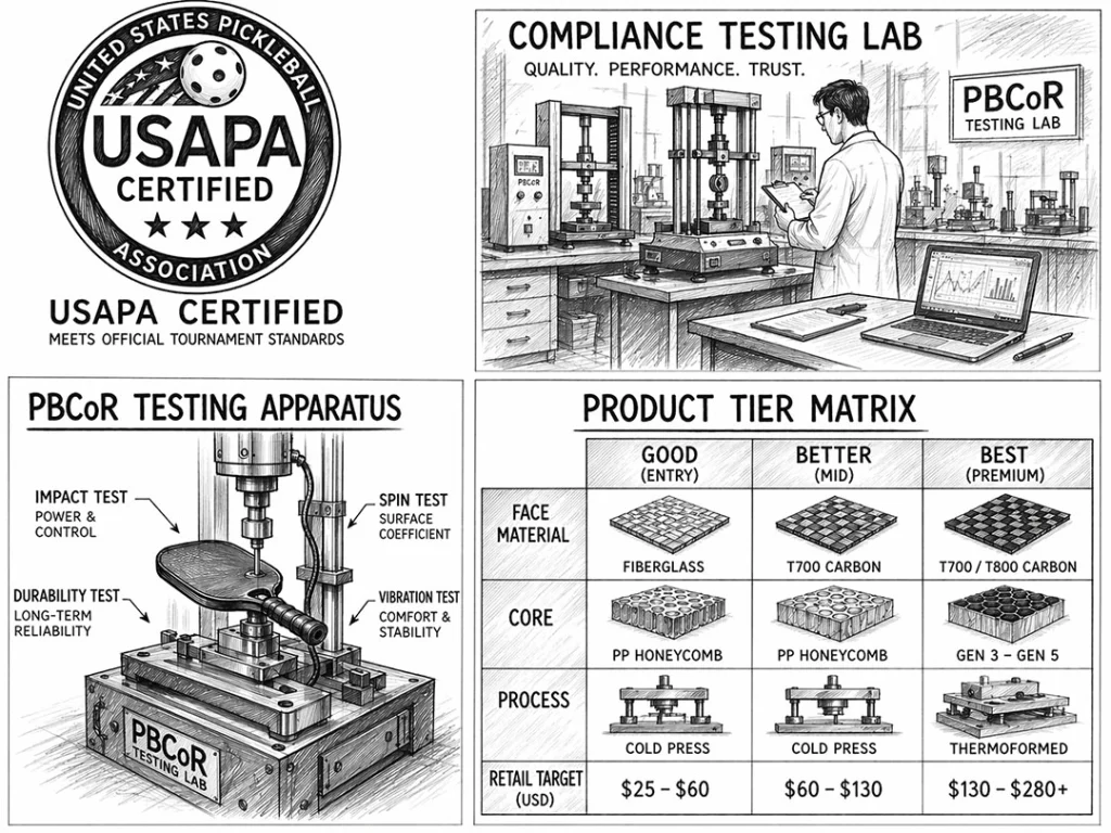 The trap for brand owners is sourcing from factories that cannot pre-test. Submitting a paddle to USAPA without in-factory PBCoR validation is an expensive gamble — certification costs $500–$1,200 per design and takes 4–6 weeks. A rejection wastes both.