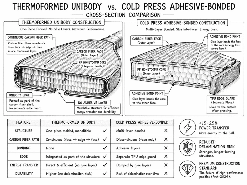 Thermoformed paddles fuse the face, core, and edge into a single unibody structure through simultaneous heat and pressure. There are no adhesive bond points. The carbon fiber runs continuously through the handle, which distributes torsional stress more evenly across the full face — producing a sweet spot 15–20% larger than a cold press paddle of identical dimensions. The price premium for thermoformed construction is real ($32–$52 OEM vs. $15–$28 OEM for cold press carbon), but so is the performance gap and the margin it supports at retail.