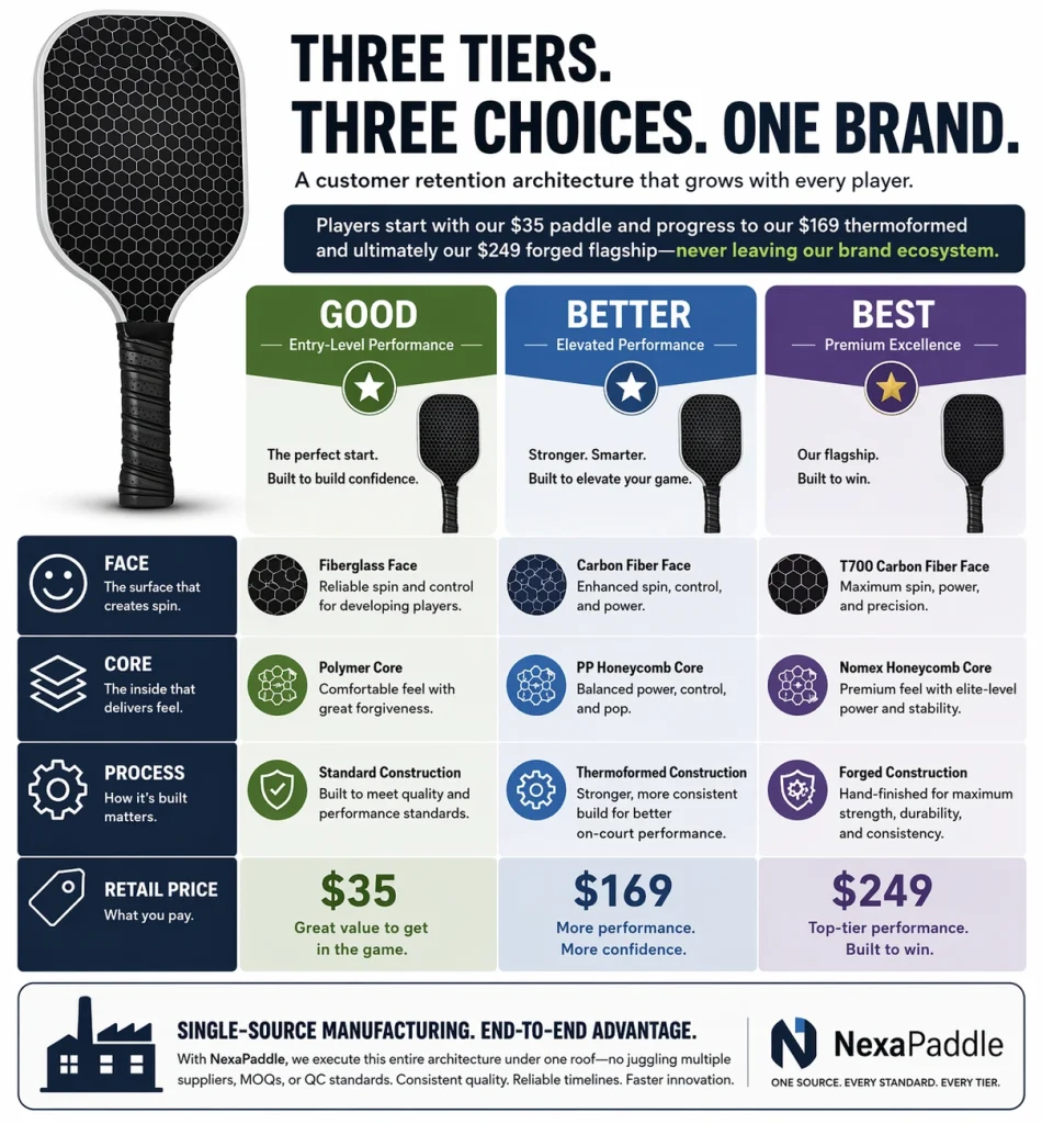 Commercial Implication: The Good–Better–Best framework is not just a catalog strategy — it is a customer retention architecture. Entry players who buy your $35 paddle and progress to your $169 thermoformed and ultimately your $249 forged flagship never leave your brand ecosystem. Single-source manufacturing from NexaPaddle means you can execute this architecture without juggling multiple supplier relationships, MOQ schedules, or inconsistent QC standards.