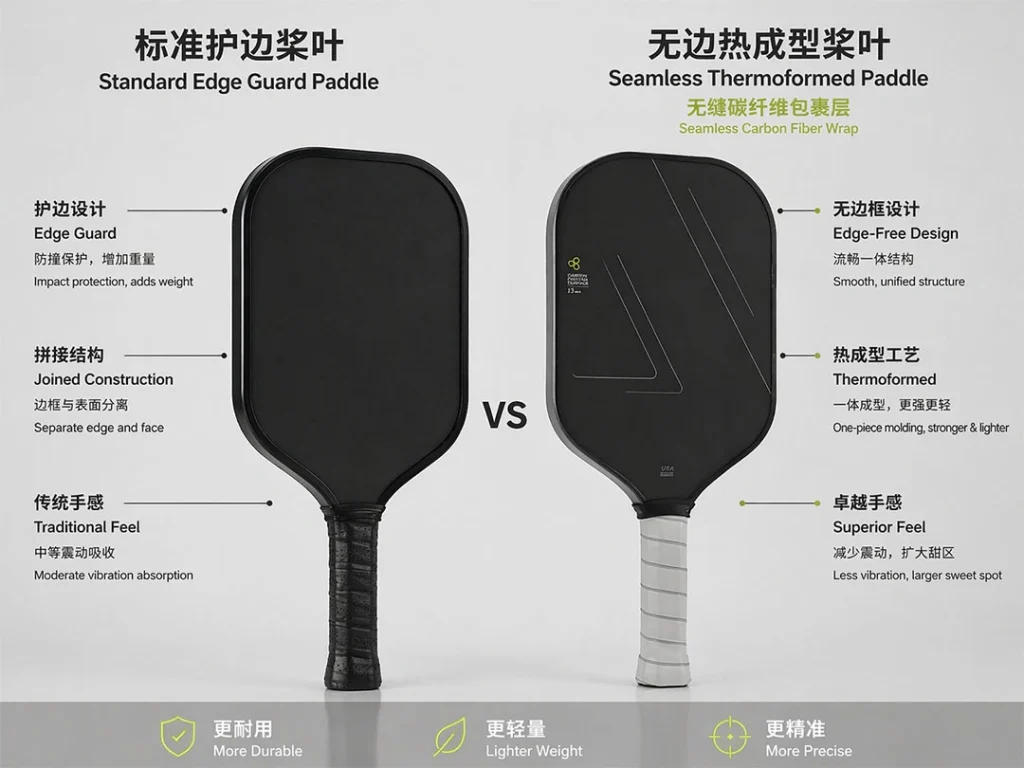 Edgeless paddles eliminate the traditional TPU edge guard, replacing it with a continuous carbon fiber wrap around the paddle perimeter. This recovers 8–10% of face real estate and produces a faster, cleaner swing profile. They are best suited for younger competitive players (18–40) who play aggressively at the kitchen line, and for DTC or design-forward brands where the seamless aesthetic adds significant perceived value in online product imagery.
