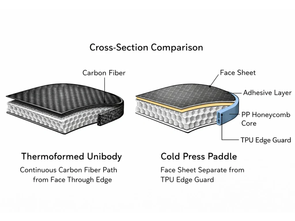Thermoformed construction is the technology that reshaped the premium paddle market. Instead of bonding face to core with adhesive at room temperature, thermoforming fuses all components — face, core, and edge — simultaneously under heat (>150°C) and pressure. The result is a unibody structure where carbon fiber runs uninterrupted from the face through the edge into the handle.