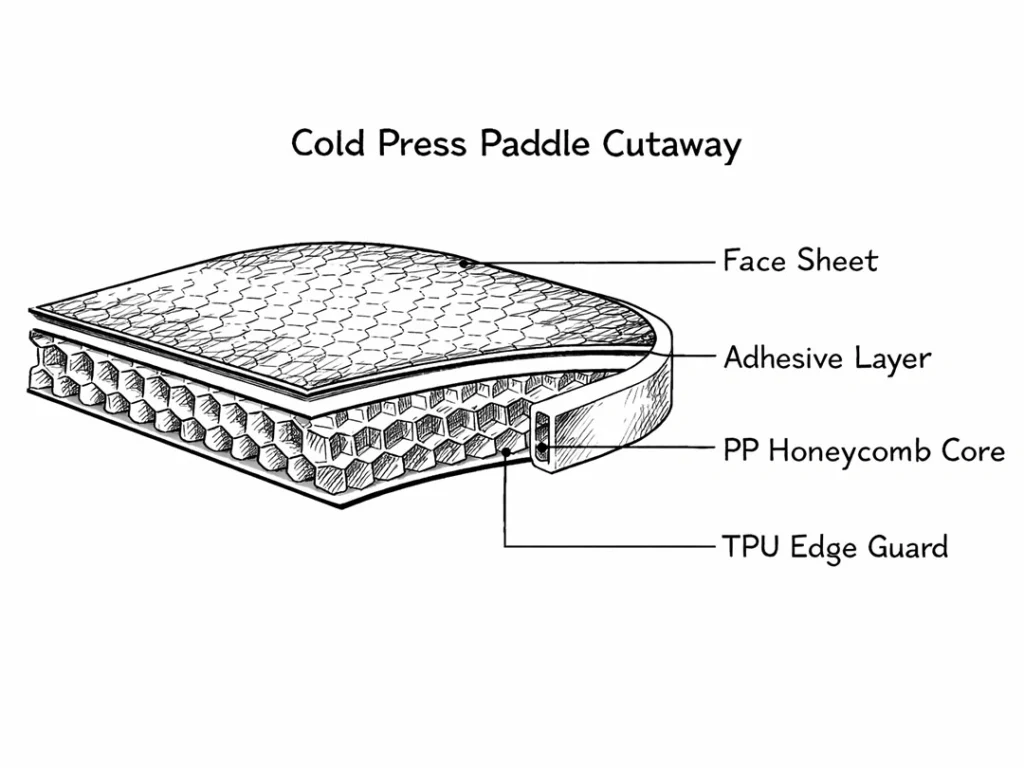 Cold press is the foundational construction method in pickleball paddle manufacturing. The process bonds a face sheet to a PP (polypropylene) honeycomb core using an adhesive film, then compresses the assembly under a hydraulic press at ambient temperature. Cycle time runs 30–45 minutes per batch — the fastest production cycle of any construction type.