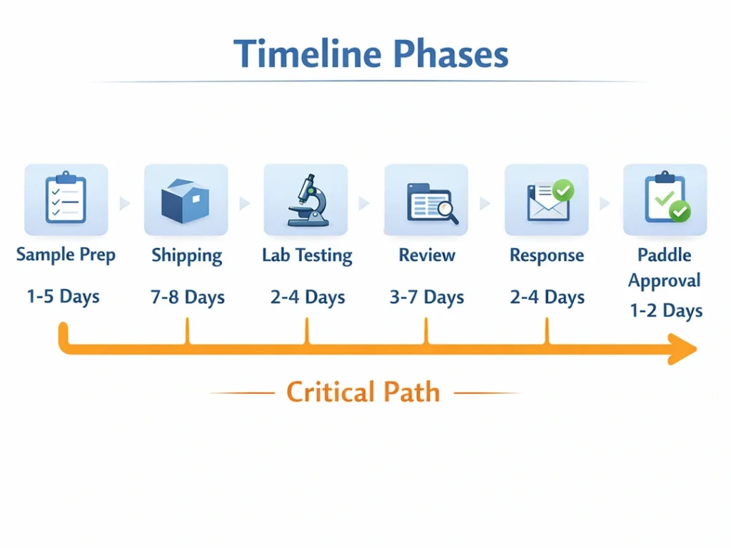 Submit application, ship samples to authorized testing lab. International shipping adds time and customs risk. Factor customs clearance delays, especially for shipments from China.