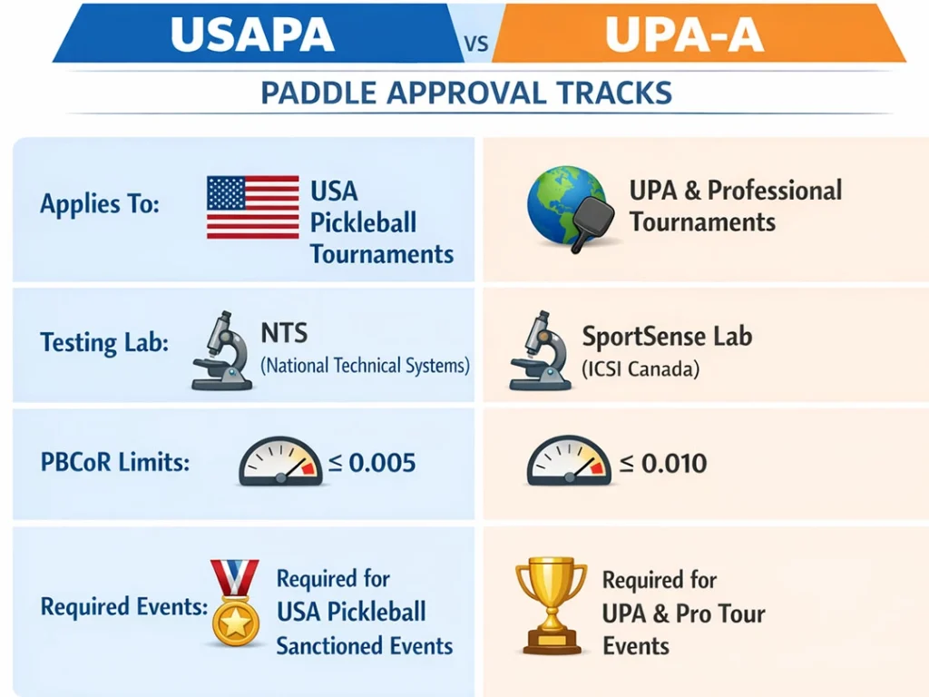 - PBCoR (Pickleball Coefficient of Restitution) limits were tightened in November 2025: maximum now ≤ 0.43 (down from previous standards)