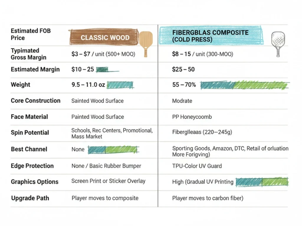 Outside those use cases, cold press fiberglass composite is the smarter wholesale choice — offering better margins in absolute dollar terms, retail viability, full-color custom branding, superior performance for actual players, and a natural upgrade path to higher-margin carbon fiber SKUs. At $8–$15 FOB with a 300-unit MOQ, it is accessible to the same institutional buyers who might otherwise default to wood.